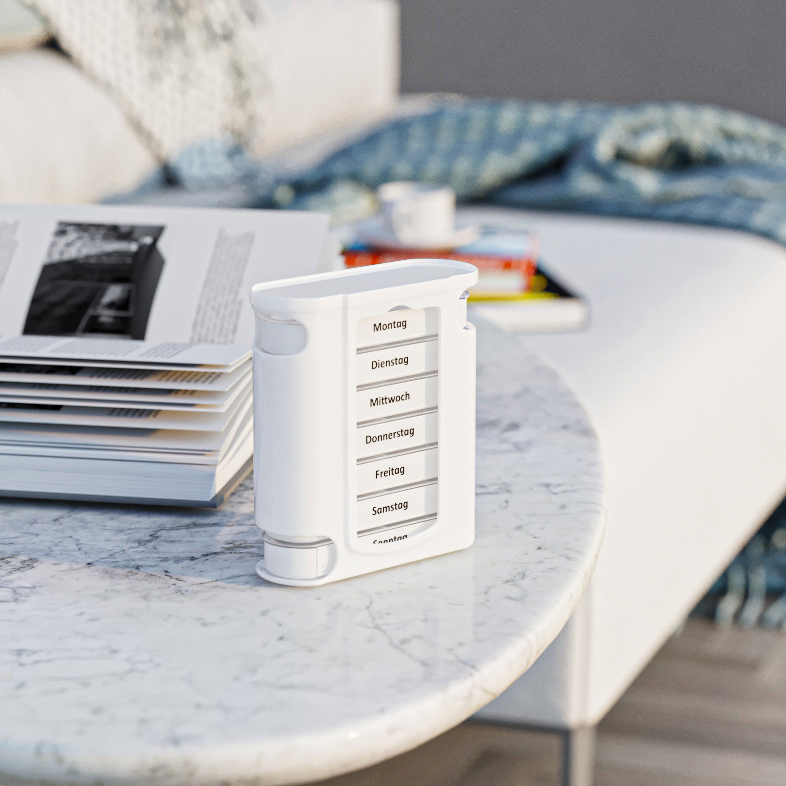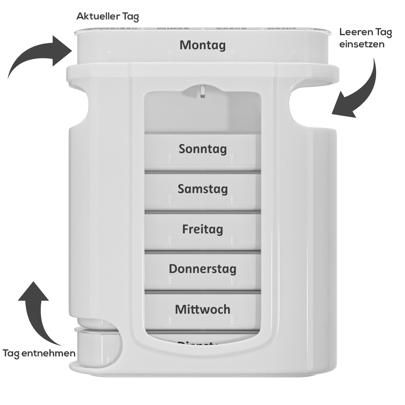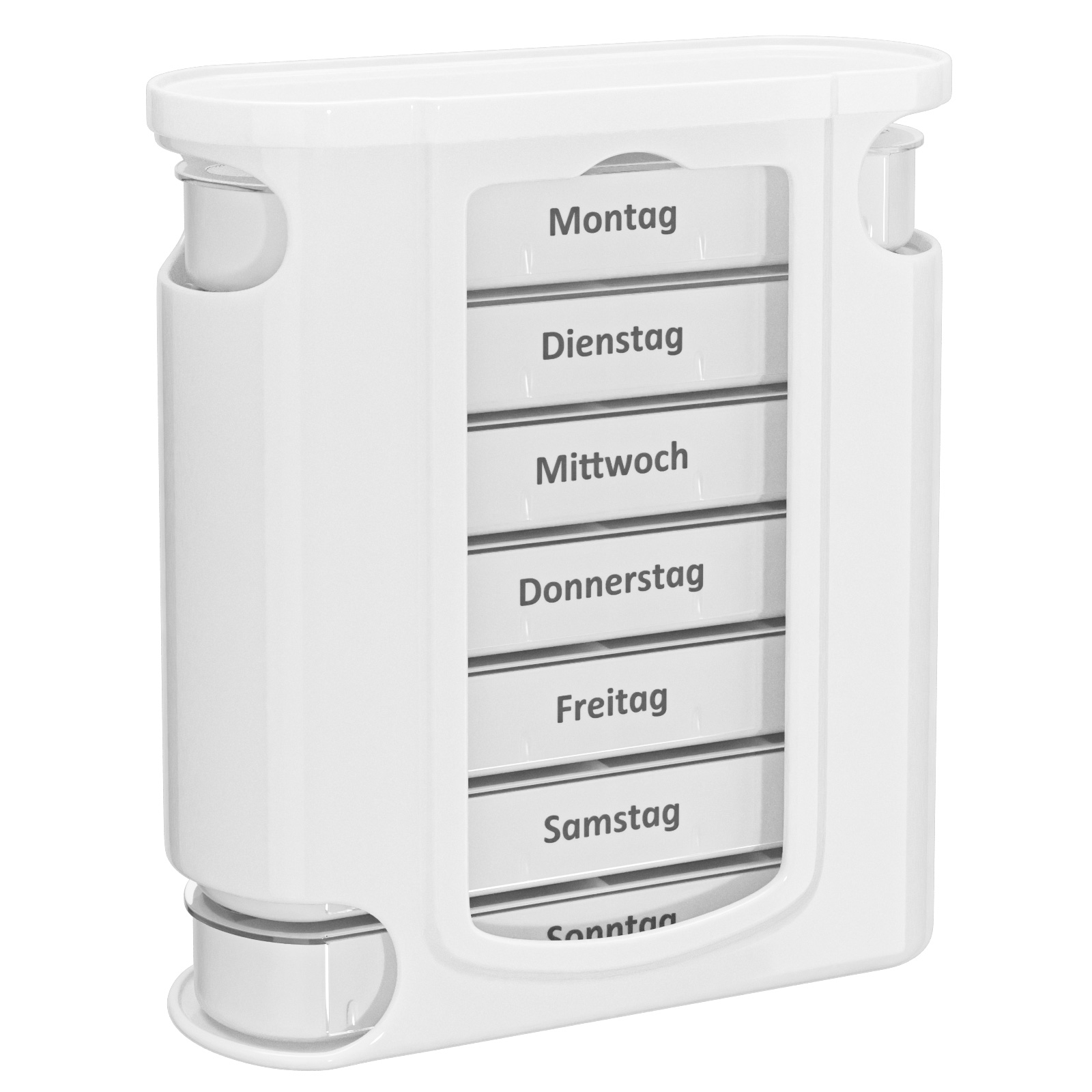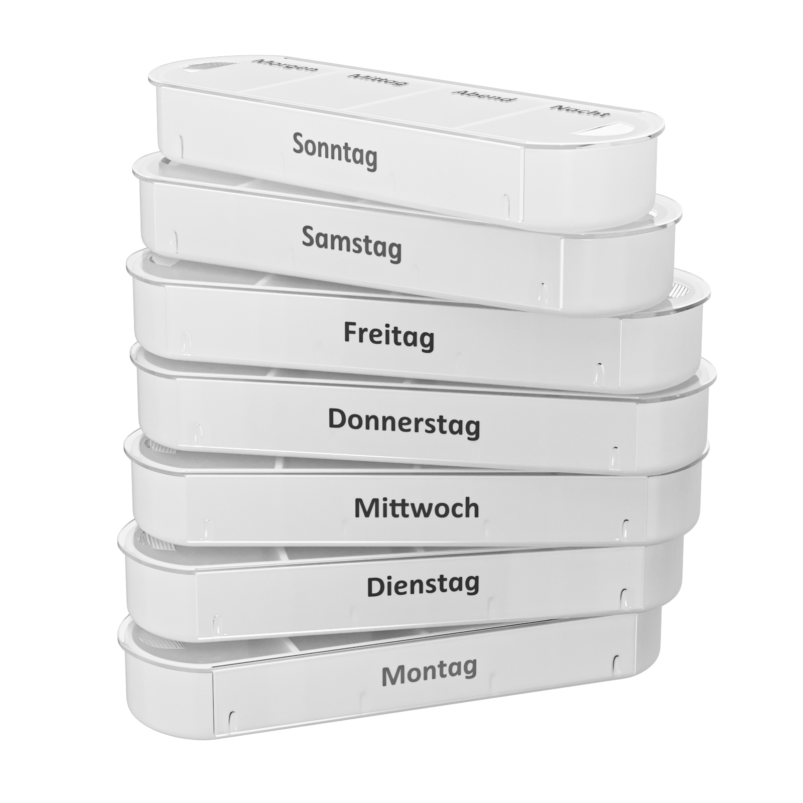 - Praktische Aufteilung: Vier separate Fächer pro Tag, beschriftet nach Tageszeiten.