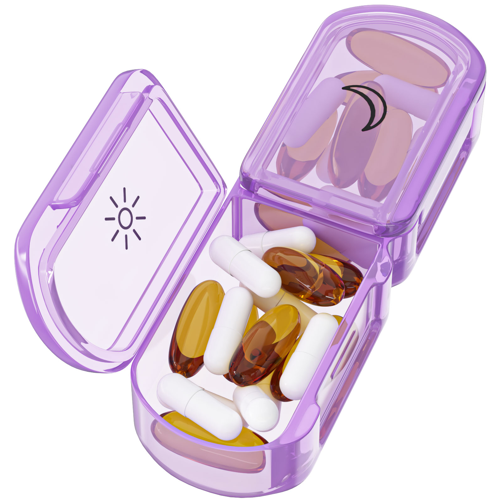 - 7 Tagesfächer mit Beschriftung der Wochentage und Symbole der Tageszeit
