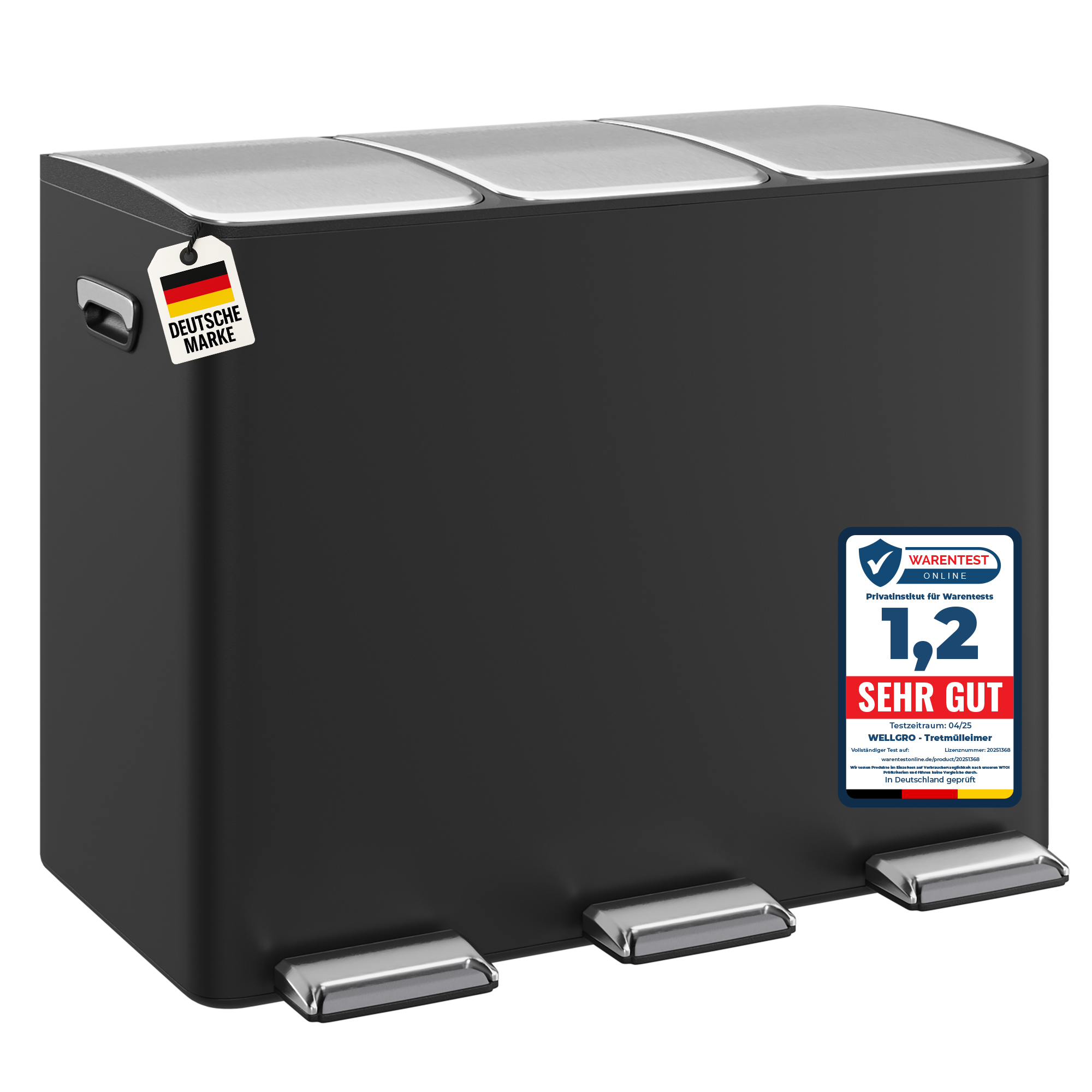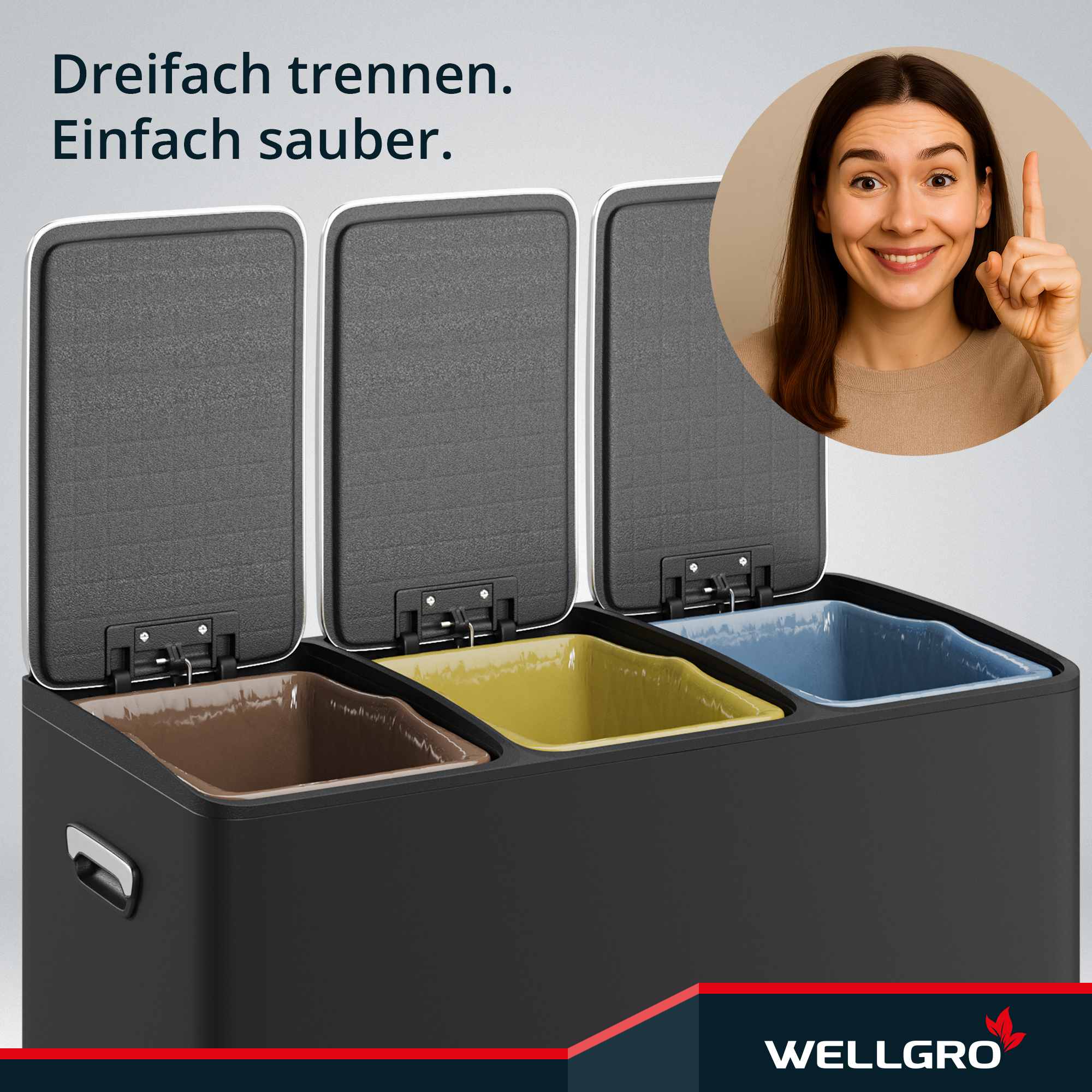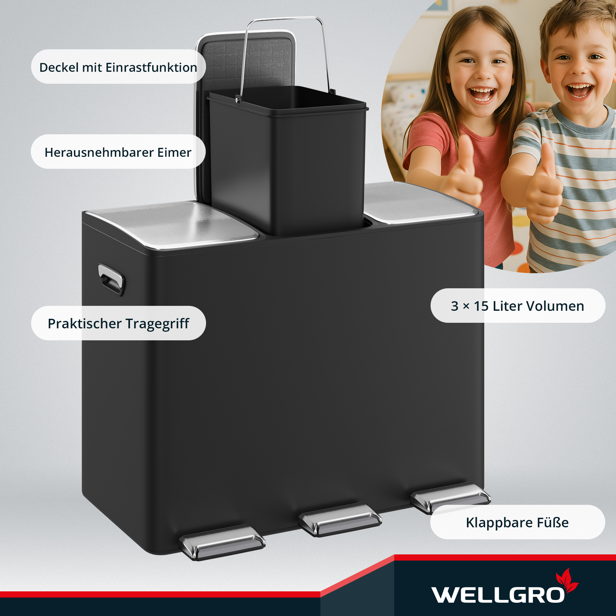 WELLGRO Treteimer, Mülleimer, Edelstahl Tretmülleimer mit 3 x 15 Liter, klappbaren Fußpedalen, Absenkautomatik und praktischen Tragegriffen