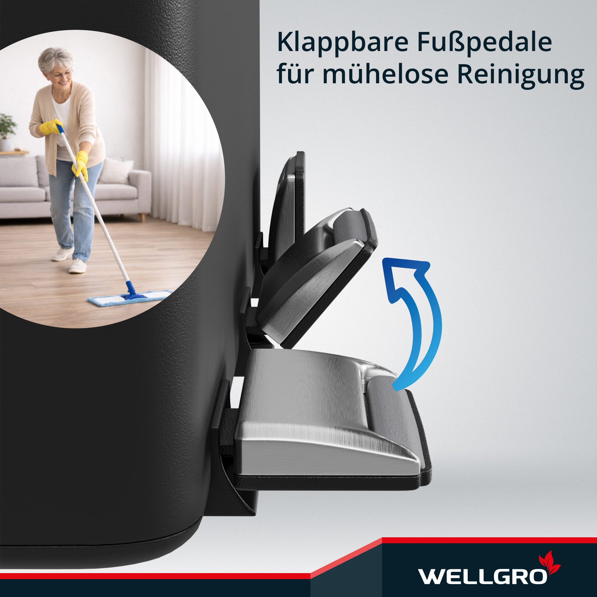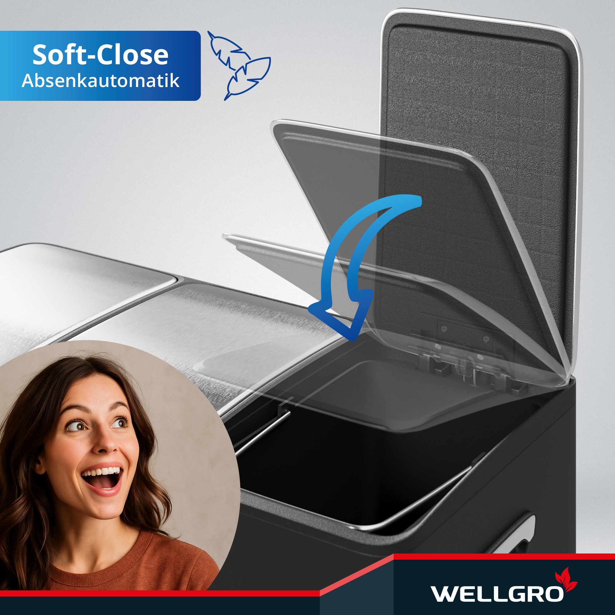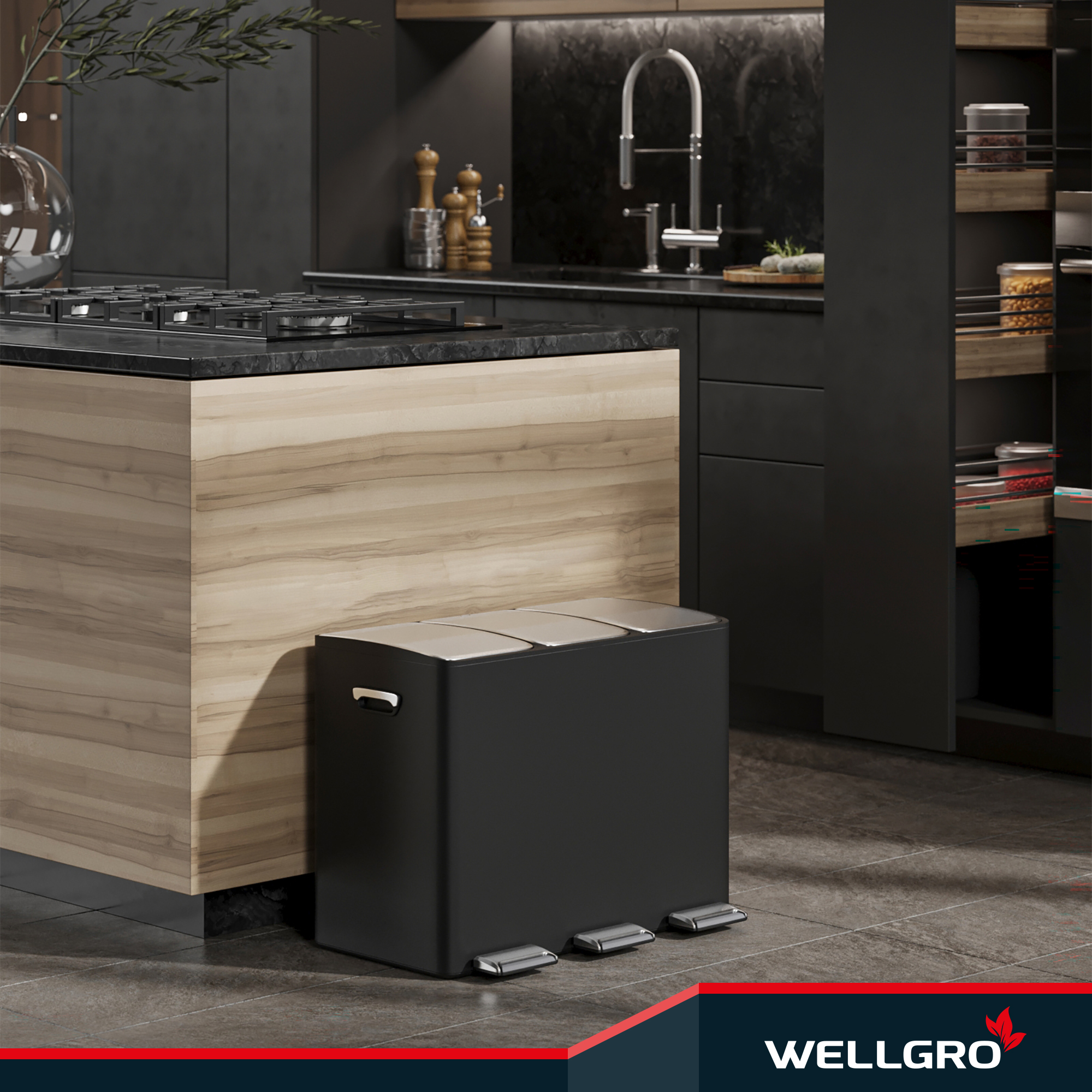 WELLGRO Treteimer, Mülleimer, Edelstahl Tretmülleimer mit 3 x 15 Liter, klappbaren Fußpedalen, Absenkautomatik und praktischen Tragegriffen