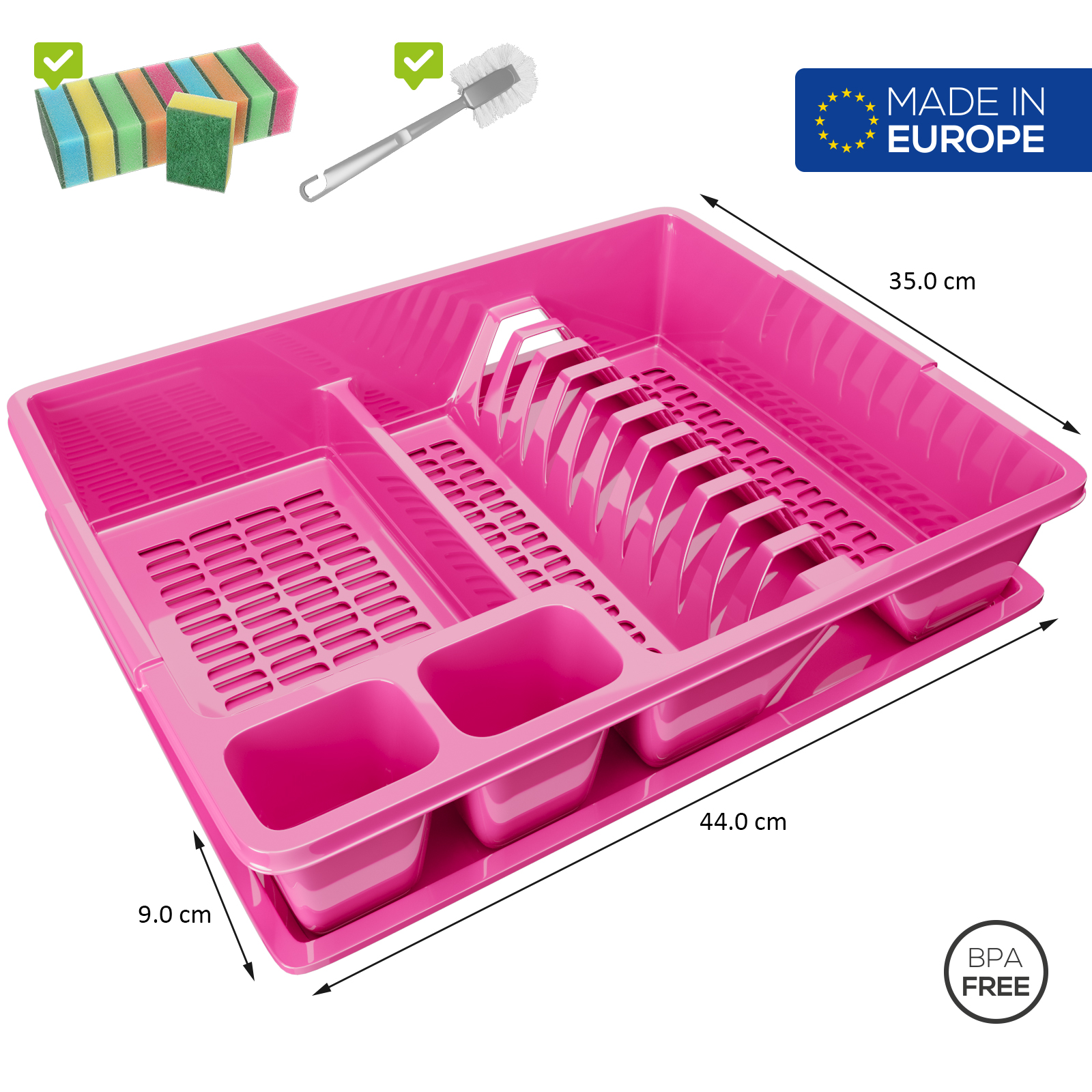 Tolles Abtropfgestell welches in keinem Haushalt fehlen sollte. Das Abtropfgestell verfügt über eine separate Schale zum Auffangen von Tropfwasser. Beide Teile lassen sich schnell und einfach Reinigen. Das Abtropfgestell ist ideal geeignet für Geschirr, Tassen und Besteck. Zusätzlich enthält diese Set eine Reinigungsbürste und zehn Schwämme - so haben Sie alles aus einer Hand.