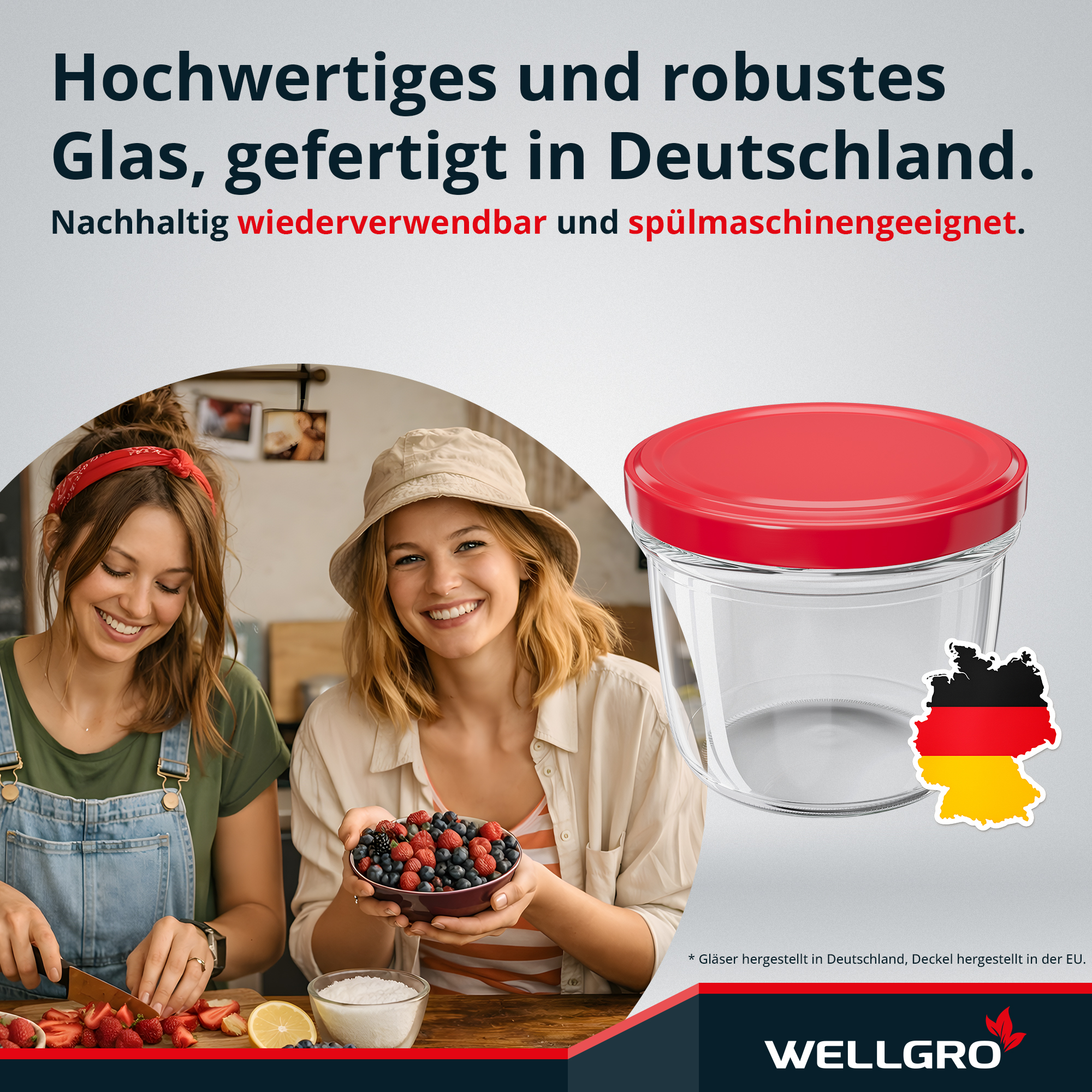 WELLGRO Einmachgläser 230ml – Schraubdeckel TO82 rot – Made in Germany – Vorratsgläser, Marmeladengläser, Aufbewahrungsgläser & Gärgläser