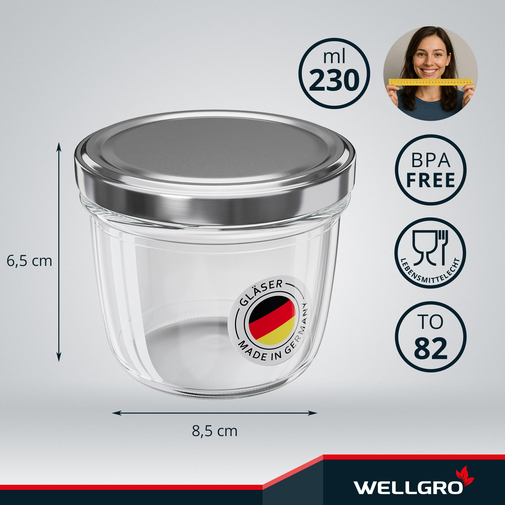 WELLGRO Einmachgläser 230ml – Schraubdeckel TO82 silber – Made in Germany – Vorratsgläser, Marmeladengläser, Aufbewahrungsgläser & Gärgläser
