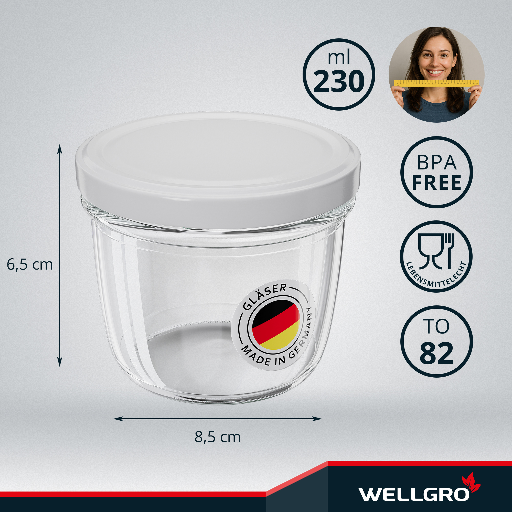 WELLGRO Einmachgläser 230ml – Schraubdeckel TO82 weiß – Made in Germany – Vorratsgläser, Marmeladengläser, Aufbewahrungsgläser & Gärgläser