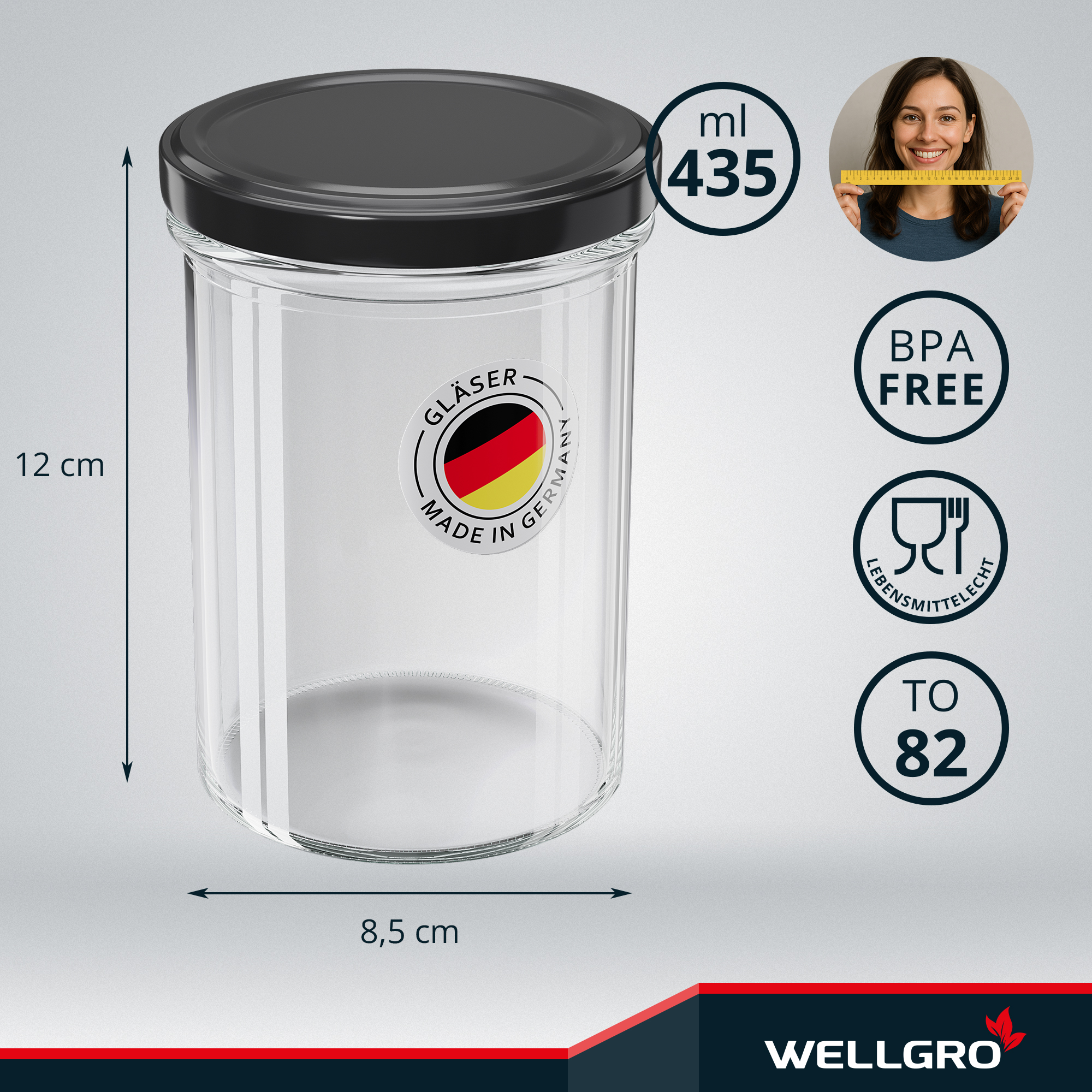 WELLGRO Einmachgläser 435ml – Schraubdeckel TO82 schwarz – Made in Germany – Vorratsgläser, Marmeladengläser, Aufbewahrungsgläser & Gärgläser