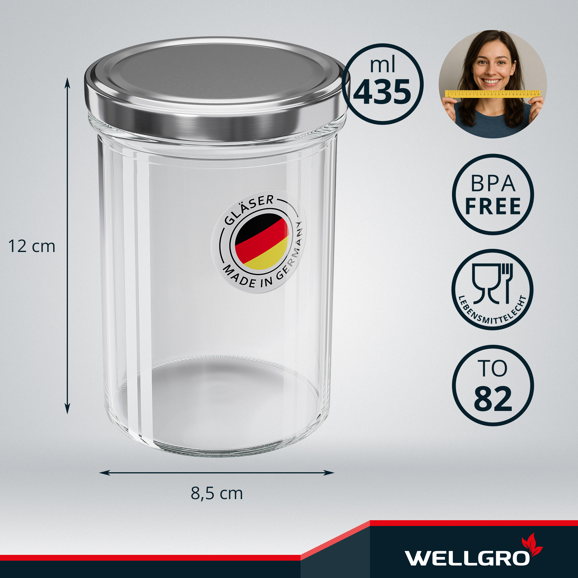 WELLGRO Einmachgläser 435ml – Schraubdeckel TO82 silber – Made in Germany – Vorratsgläser, Marmeladengläser, Aufbewahrungsgläser & Gärgläser