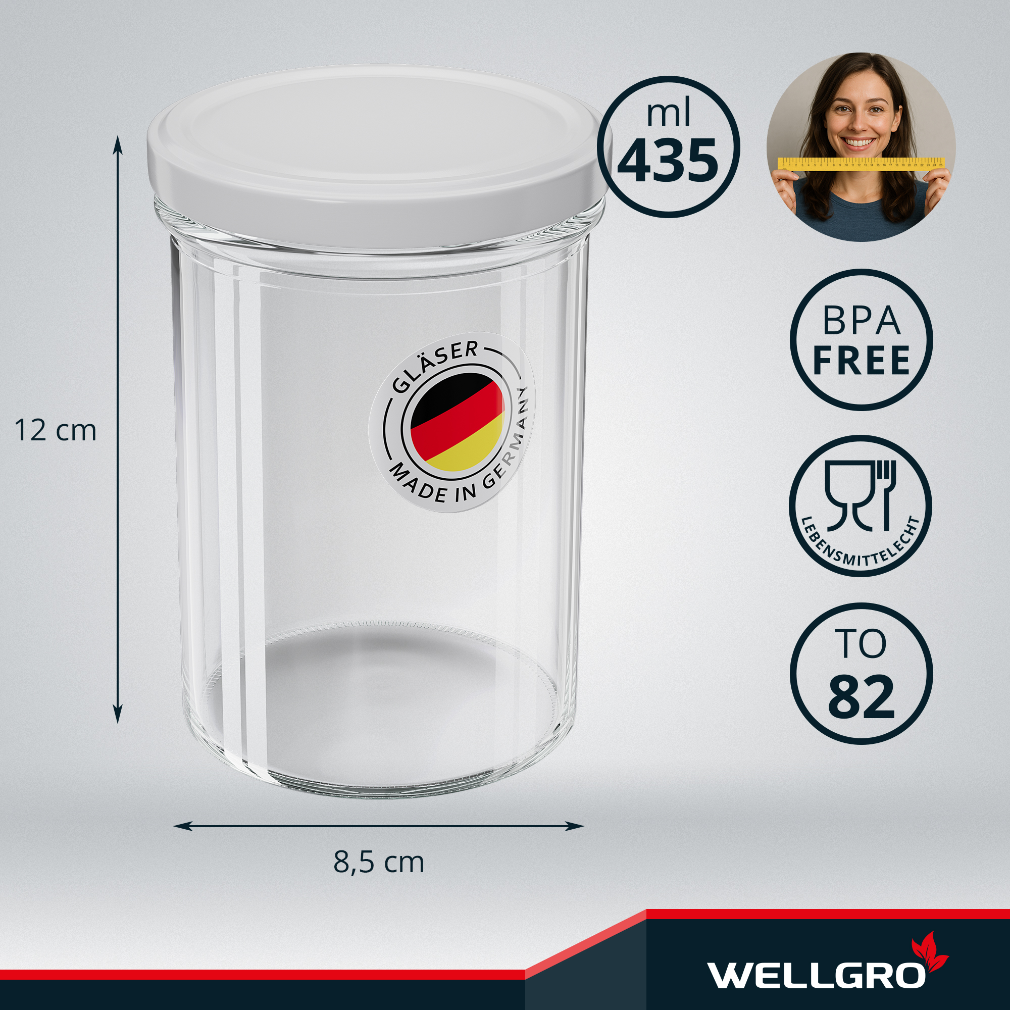 WELLGRO Einmachgläser 435ml weiß – Schraubdeckel TO82 weiß – Made in Germany – Vorratsgläser, Marmeladengläser, Aufbewahrungsgläser & Gärgläser