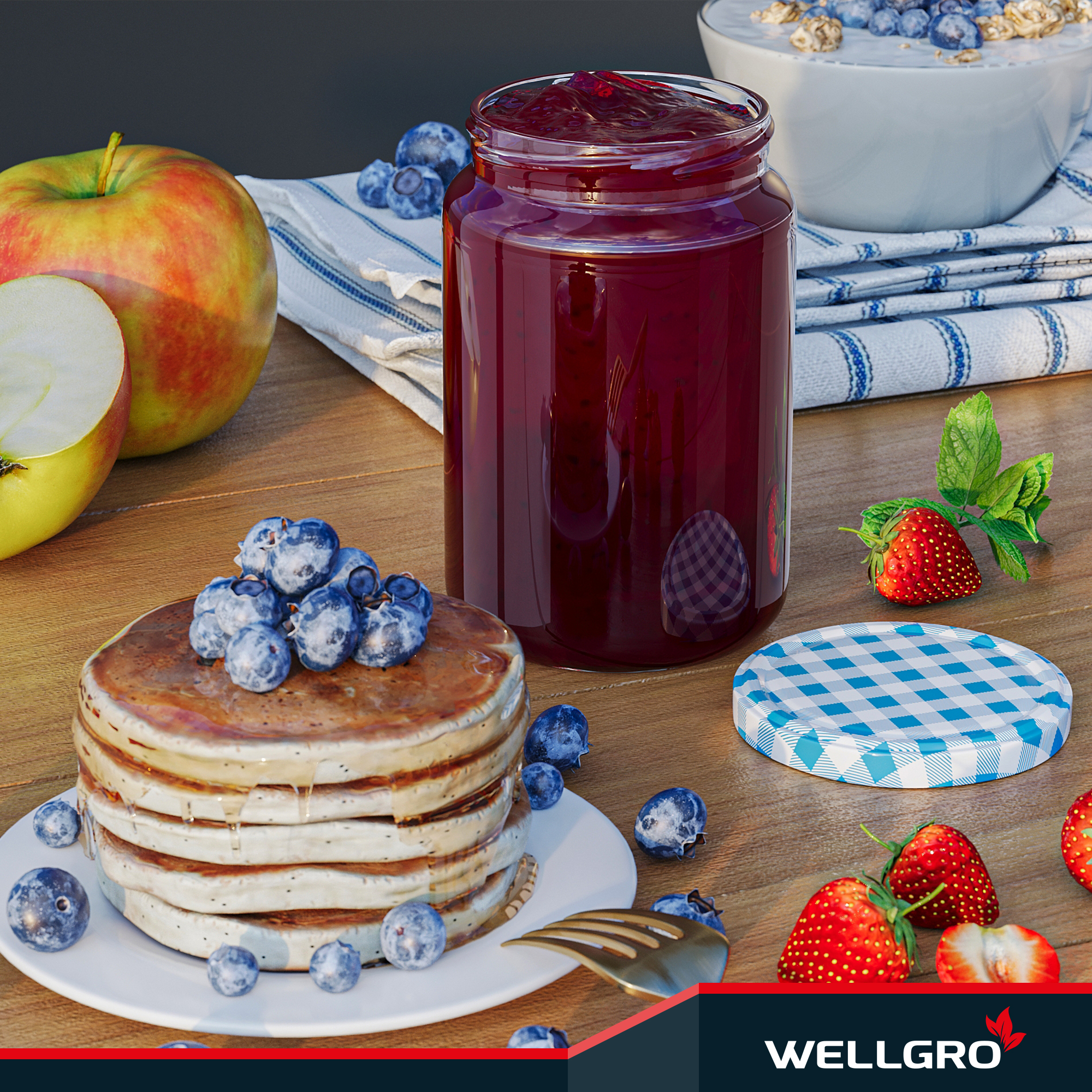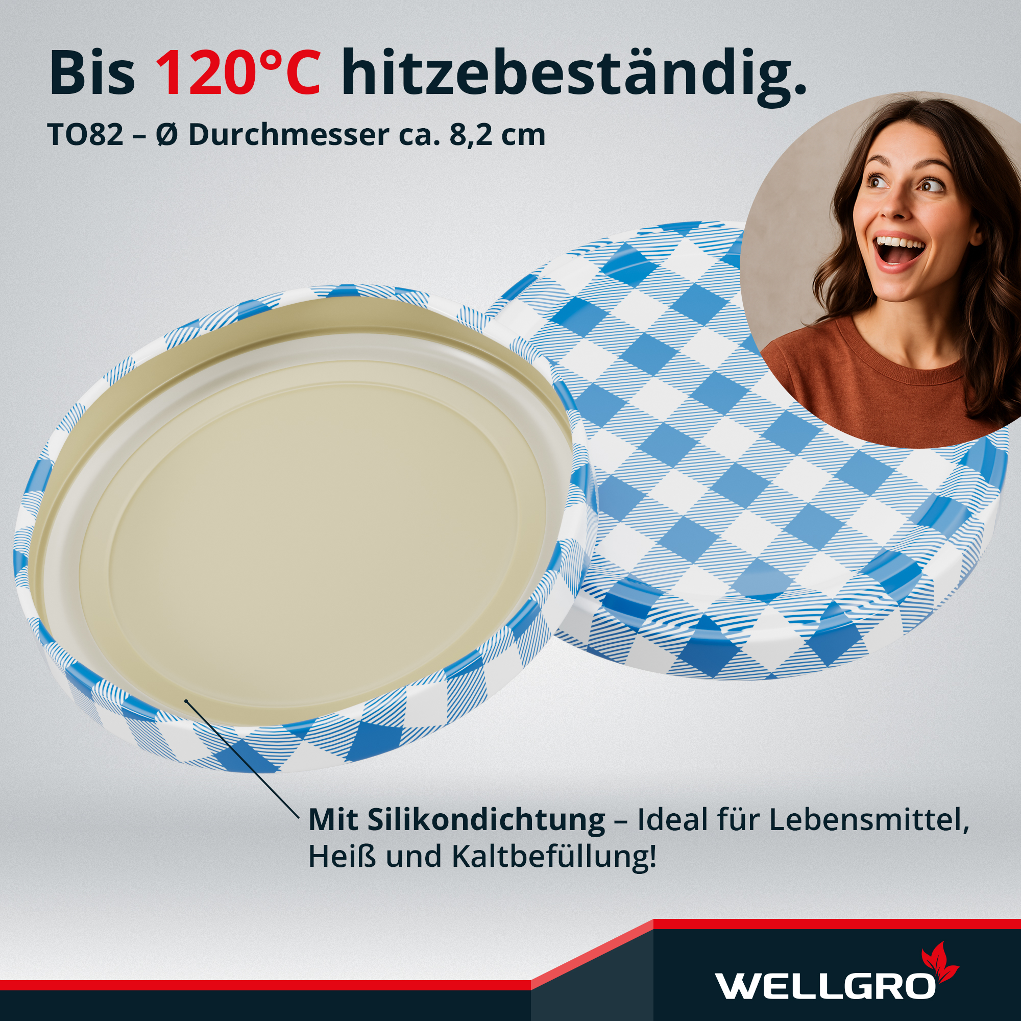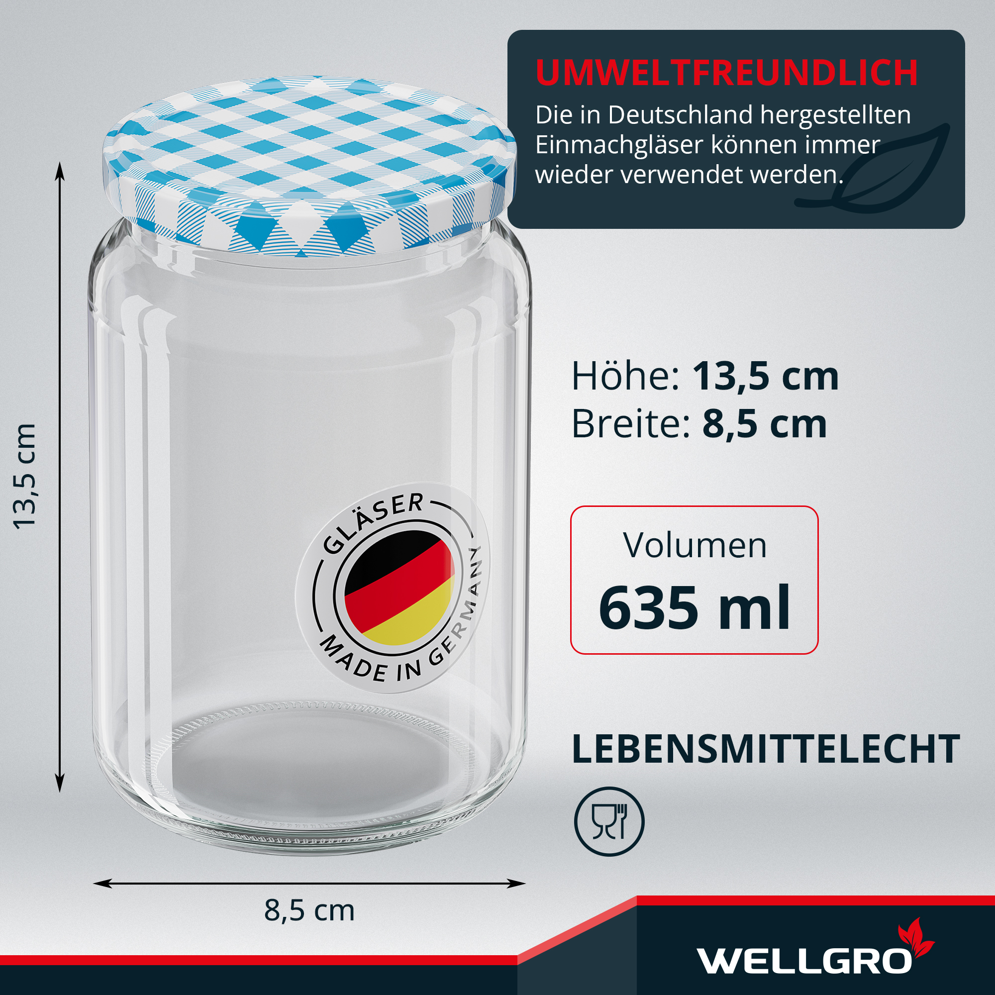 WELLGRO Einmachgläser mit Schraubdeckel TO 82 – blau kariert - Made in Germany - Luftdichte Rundgläser ideal zum Einkochen und Aufbewahren