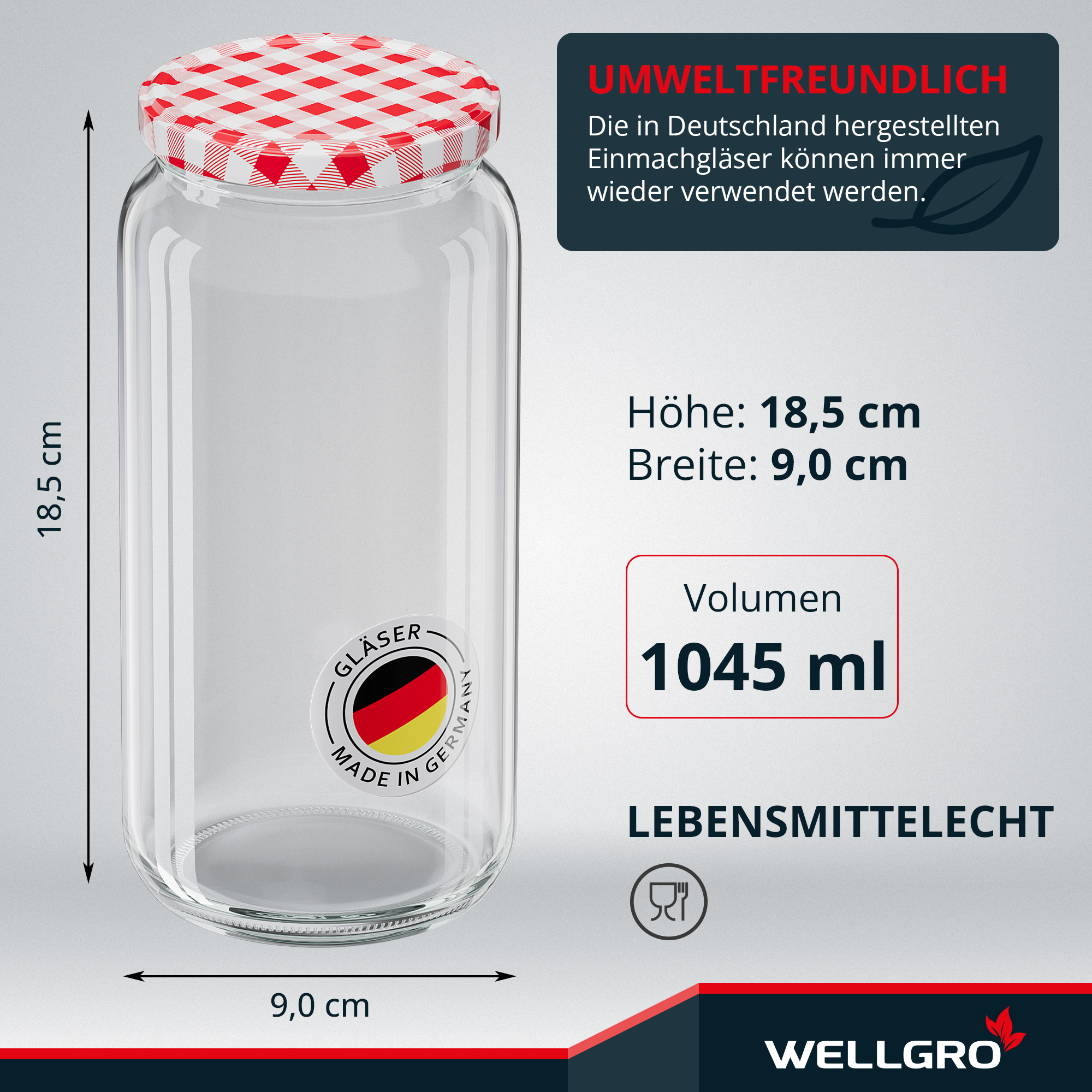WELLGRO Einmachgläser mit Schraubdeckel TO 82 – rot kariert - Made in Germany - Luftdichte Rundgläser ideal zum Einkochen und Aufbewahren